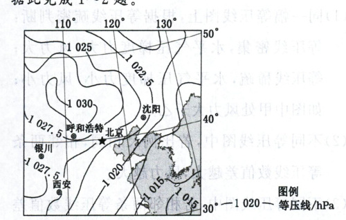下图示意某时刻亚洲局部区域海平面气压分布。据此完成1~2题。