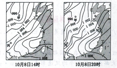 下图示意亚洲东部某区域两个时刻近地面等压线分布(单位:hPa)。据此完成3~4题。