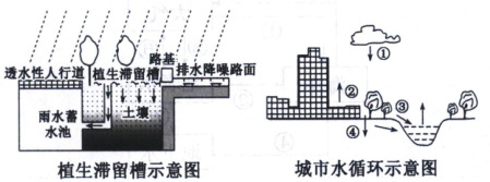 下面两图分别为城市植生滞留槽示意图以及城市水循环示意图。读图,完成3~4题。