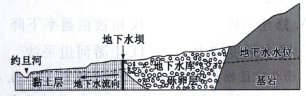 位于西亚的约旦河流域降水稀少。当地人修建地下水坝,借助由砾卵层组成的天然地下储水空间存蓄地下水,形成地下水库。如图示意约旦河东侧沿32°N地质剖面(局部)。据此完成1~2题。