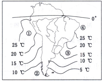 下图是南美洲周边海域海水温度分布图。据此完成(1)~(2)题。