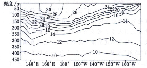 下图为某年2月赤道太平洋海域海水月平均温度(单位:°C)随经度和深度分布图。读图,完成1~2题。