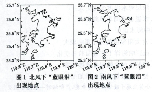 [材料] “蓝眼泪”景观由聚集成群的夜光藻在受到适度扰动时发光形成,在特定的海水温度、盐度范围内多出现在开敞的海湾,易被巨浪干扰破坏。位于福建省东部海域的平潭岛是我国著名的“追泪”胜地。该岛主导风向为偏北风和偏南风,8级风天数占全年的四分之一。4—5月盛行偏北风时,“蓝眼泪”景观出现的概率最大。下图示意平潭岛某年不同主导风向下“蓝眼泪”出现地点(即图中黑点)。