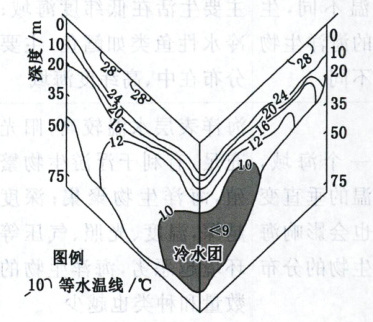 [材料] 温跃层是位于海面以下温度和密度有巨大变化的薄薄一层,是上层的薄暖水层与下层的厚冷水层间出现水温急剧下降的层。中纬度海区的温跃层较深,低纬度海区的温跃层较浅。主要是由于太阳辐射、地球自转、海水运动等综合作用的结果。下图为某海域某月海水温度垂直结构示意。