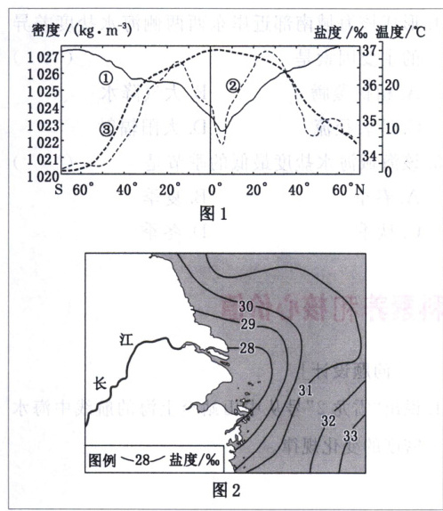 图中曲线①表示海水表层密度分布;曲线②表示海水表层盐度分布;曲线③表示海水表层温度分布。