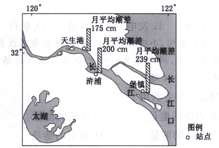(2024·安徽高考·节选)潮差是指潮水的一次涨落过程中最高水位与最低水位之差。下图为 2024 年 4 月上海堡镇、苏州浒浦、南通天生港三地的月平均潮差。据此完成下题。
