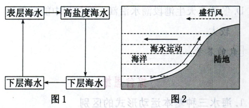 (1)高盐度海水密度较大,在重力作用下海水下沉,在下层形成水平压力,使得海水由高密度处流向低密度处;表层海水密度小,海平面较低,海水从密度较小的海区流向密度较大的海区,下层海水上升补充。
