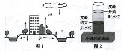 2. 表中,甲处数据约为_________。实验表明“海绵城市”使得图1中水循环的_________(填字母)环节水量增大。