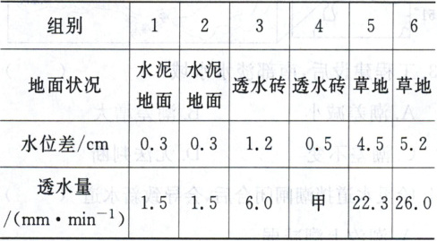 材料二 某校地理实验小组在校园内进行不同路面透水差异的实验探究。实验将有机玻璃桶按压在地面并倒水,120秒后标记剩余水位并计算透水量。