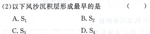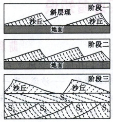 沙粒在被风搬运的过程中,从迎风坡向前运动到背风坡滑落堆积下来。随着沙粒不断地搬运和堆积,在沙丘内部形成与背风坡倾斜方向一致的斜层理。当风向发生改变时,沿着沙粒前进方向又会形成新的沙丘。如图示意某地区地质地貌发育的不同阶段。据此完成(1)~(3)题。