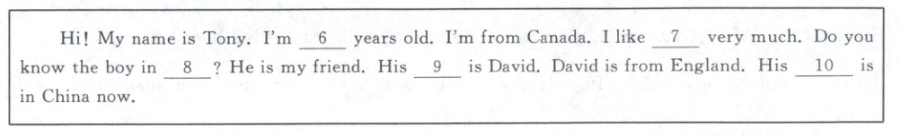 B. Hi! My name is Tony. I'm 13 years old. I'm from Canada. I like English very much. Do you know the boy in red? He is my friend. His name is David. David is from England. His father is in China now.