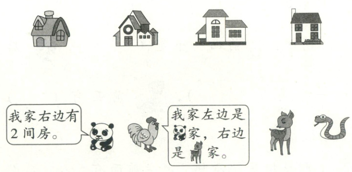 熊猫连第二个房子,公鸡连第三个房子,小鹿连第四个房子,蛇连第一个房子。