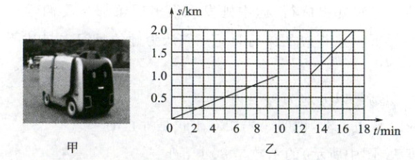 9. 如图甲所示的无人快递派送车已应用于很多大学城,某次该车从快递驿站出发,$ 10 \, min $后到第一个派送点停靠并派送快递,完成任务后再次出发开往下一个派送点,其路程 $ s $与时间 $ t $ 的关系如图乙所示. 下列分析正确的是(