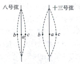 7. 分别拨动古筝的八、十三号弦,如图所示用同一设置的相机拍摄到两弦最左摆到$b$处,最右摆到$c$处,静止时在$a$处.测出每振动$880$次,八号弦用时$2\ s$,十三号弦用时$4\ s$,则(