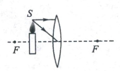 32. 如图所示,已知凸透镜的两个焦点,点燃的蜡烛位于凸透镜焦距以内.请在图中用作图法画出烛焰S点的像$S’$.