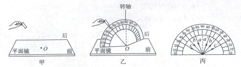(选填“前”或“后”)折转.(3) 保持入射点不变,多次改变入射方向,在光屏上记录每次实验的光路$aa’$、$bb’和cc’$,如图丙所示.为了研究反射光线和入射光线的位置关系,发现左、右半屏相对应的光线关于转轴对称,因此可将此对称轴视为