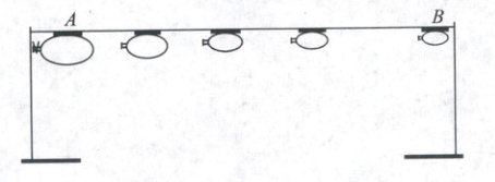 22. 将气球吹大,用夹子把口封紧,剪取一段 $10$ cm 长的吸管,用胶带把它固定在气球上,将一根细绳穿过吸管水平拉直,两端固定. 把气球封口的夹子松开,气体向后喷出,气球向前运动. 运动过程中气球与吸管保持相对静止. 如图所示是气球运动时每隔 $0.5$ s 的频闪照片,则气球从 $A$ 位置运动到 $B$ 位置过程中做