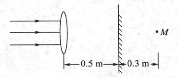28. 如图所示,把一凸透镜放在平面镜前,当用眼睛观察镜子时,光束似乎是从 $M$ 处发散开来的,则光束会聚处和 $M$ 点的距离是