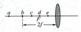 27. 在“研究凸透镜成像”的实验中,点燃的蜡烛分别放在 $a$、$b$、$c$、$d$、$e$ 五个位置,如图所示,其中蜡烛放在