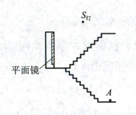 29. 如图所示,学校教学楼楼梯拐角处墙上装了一面镜子,在方便同学们日常整理仪容的同时,也能更好地通过光的反射对楼道进行照明,节约用电. 请画出灯 $S$ 经过镜子照射到下层楼道 $A$ 点的光路及灯 $S$ 在镜中的像 $S'$.