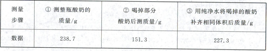 25. 小明为测量酸奶的密度,先观察了瓶上标注的酸奶净含量为$230$克,然后借助天平测量了一些数据并记录在下表中$(\rho_{水}= 1.0×10^{3}kg/m^{3})$,求: