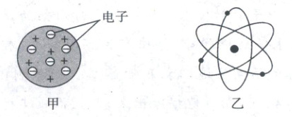 在 1889 年发现电子,认识到原子是可分的,进而提出原子结构的“枣糕”模型(如图甲所示);1911 年,卢瑟福