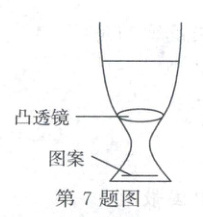 7. 有关显隐杯的记载,古籍中不乏其例.其原理是在杯内底中央置一图案,图案上盖一凸透镜.如图所示,杯中倒入酒,俯视时,图案处于酒与凸透镜组成的新透镜焦距之内,会被清楚地看到,则此时(