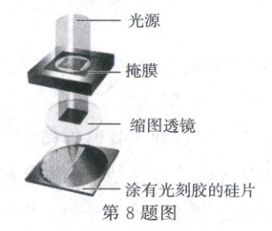 8. 2023 年 2 月哈工大宣布突破 EUV 光刻机关键技术,光刻技术是利用缩图透镜将绘制在掩膜上的电路图通过光源投射到涂有光刻胶的硅片上,从而制造出集成电路的方法,其工作原理如图所示.若图示中掩膜上的电路图恰好在硅片上成清晰缩小的像,下列说法正确的是(