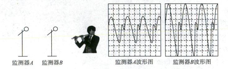 12. 如图所示,在空气均匀且温度保持在 $15^{\circ}C$的室内,吹响长笛一个音,用$A$、$B$两个相同的声音监测器在不同距离的位置监测,得出如图所示的$A$、$B$波形图,则声音从监测器$B处传播到监测器A$处的过程中,下列说法不正确的是(