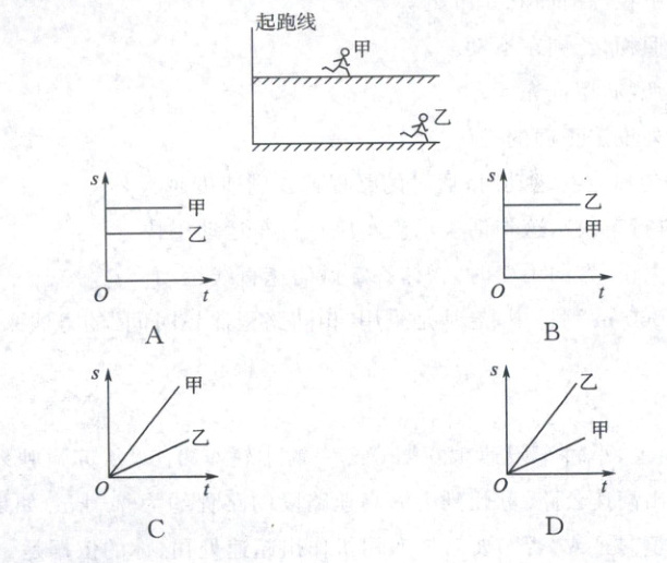 2. 如图所示,甲、乙两人同时从同一起跑线出发,同向做匀速直线运动,某时刻他们的位置如图所示.下列能反映两人运动距离与时间关系的是(