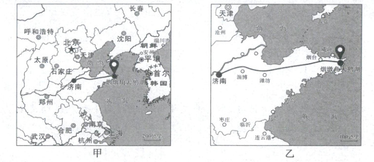 2023 年春节假期,济南的琳琳一家人开车到荣成市烟墩角村观赏大天鹅。琳琳利用手机导航软件查找路线时,通过缩放屏幕获得了甲、乙两幅地图(下图)。结合所学知识,完成 6—7 题。