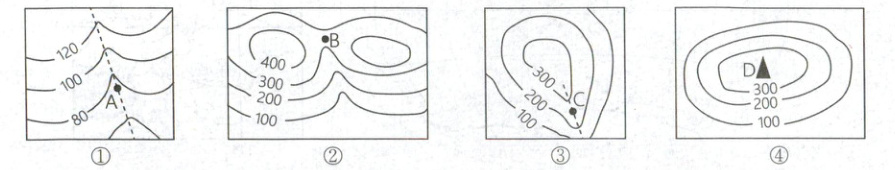 )A.①山谷 ②山脊 ③山顶 ④鞍部