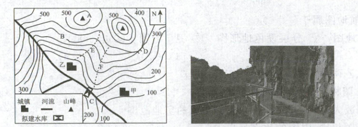为了解乡村振兴战略的实施情况,烟台市某中学地理兴趣小组在我国某地区进行实地考察。下面左图为该区域等高线地形图(单位:米),下面图为该区域玻璃栈道景观。据此完成 14—16 题。