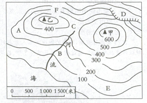 11. 甲、乙两山峰的相对高度约为(