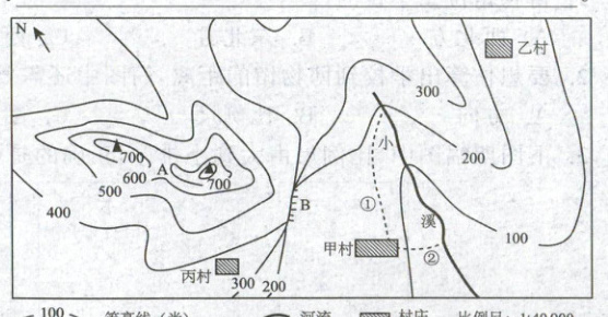 村。(4)甲村准备从小溪引水入村,规划了①②两条线路,其中溪水能够自流人村的是