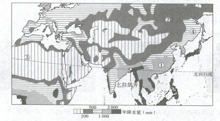 地。(2) 某人从④地出发,经过②地,到达⑤地,其经过地区的年降水量变化规律是多—少—多,由此证明亚欧大陆的中纬度地区年降水量分布特点是由东西沿海向中部减少,形成这样特点的主要原因是(