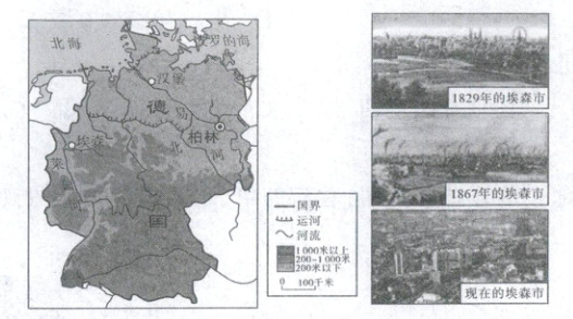 聚落是人类的居住地。随着聚落的发展,其景观也会发生变化。下图为德国地形图及埃森市景观变化图。读图,完成 5—6 题。