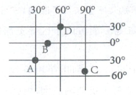 D.D点的经纬度是$(60^{\circ}N,30^{\circ}E)$