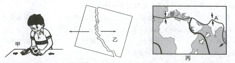 17. 某学生在学习“板块运动”时,用纸和书本做了一个实验。读甲、乙、丙图,完成下列问题。(20分)