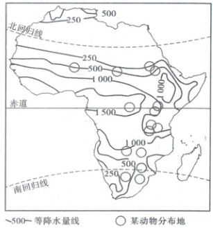 生物不能脱离环境而存在,必须依赖并适应环境,以维持其生存和发展。右图示意非洲大陆年降水量和某动物分布地。据此完成 8—9 题。
