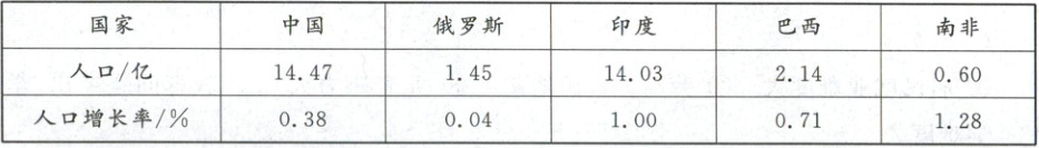 材料二 下图为金砖国家分布示意图,下表为金砖国家2022年人口概况。