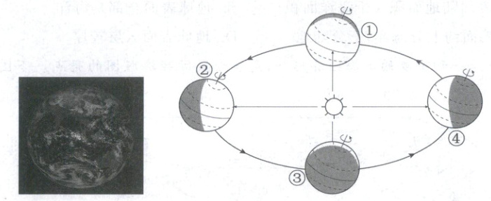 2020年11月24日,“嫦娥五号”在我国文昌(19.6°N,110.7°E)航天基地发射成功,历时23天,带回约2kg的月壤,在内蒙古的四子王旗(42°N,112°E)成功着陆,开启我国探月新时代。结合“嫦娥五号”在太空中拍摄的地球照片和地球公转运动示意图,完成1—3题。