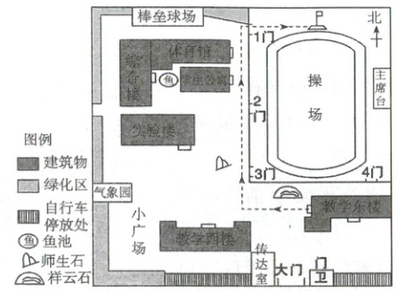 某中学小萱同学学习完“地图”一课后,根据所学知识绘制了校园平面图,她的教室在教学东楼。读校园平面示意图,完成13—15题。