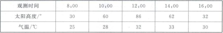 实践与活动题:我国某市某地理活动小组为观测太阳高度对气温的影响,选择一个阳光灿烂的日子,在学校操场上竖一根木桩,利用木桩和影子测算太阳高度角,同时记录当时的气温(如下表)。请根据观测记录的结果,完成27—28题。