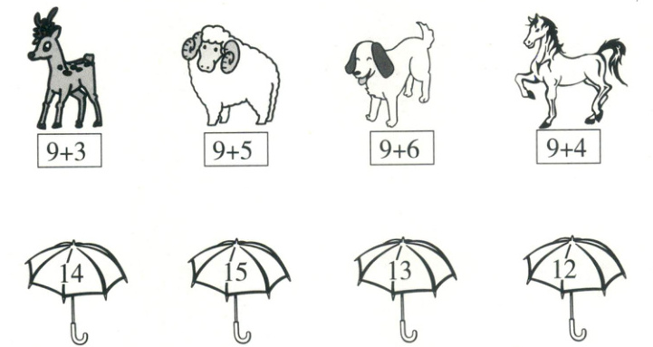 所以连线为:鹿($9 + 3$)连$12$的伞;羊($9 + 5$)连$14$的伞;狗($9 + 6$)连$15$的伞;马($9 + 4$)连$13$的伞。