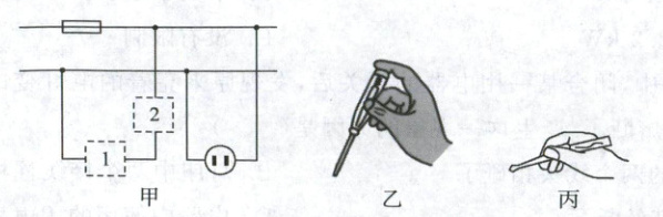 10. 小明同学想在家里安装一盏照明灯,如图甲所示是他设计的电路,图中虚线框 1 和 2 应连入开关和电灯,则开关应安装在____(选填“1”或“2”)框中。为了检测家庭电路中插座右孔连接的是不是火线,应使用如图____(选填“乙”或“丙”)所示的捏验电笔的方式。