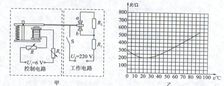25. 图甲是只有加热、保温功能的电热水器的简易电路图,控制电路中,电源电压$U_1 = 6V,Rₜ$为阻值可调的电阻,热敏电阻R允许通过的最大电流Iₘₐₓ = 15mA,其阻值随温度变化关系如图乙,电磁继电器线圈电阻不计.工作电路中,电源电压$U_2 = 220V,$电阻$R_1 = 22Ω,R_2 = 198Ω.$当电磁继电器线圈的电流I ≤ 8mA时,衔铁上弹与触点a接通;当电磁继电器线圈的电流I ≥ 10mA时,衔铁被吸下与触点b接通.求: