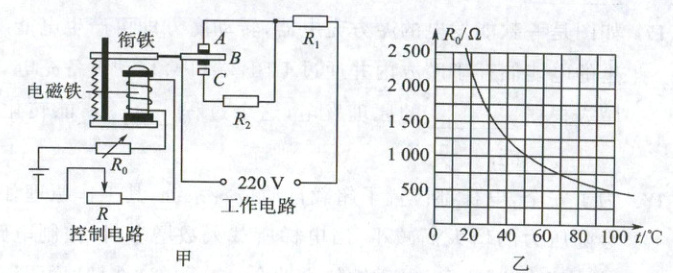 25. 如图甲是某多功能养生壶内部简化电路,由控制电路和工作电路两部分组成.R₀为热敏电阻,其阻值随监测水温变化图像如图乙所示.控制电路电源电压为6V,R为滑动变阻器,电磁继电器线圈的电阻忽略不计,当继电器线圈电流达到5mA时,衔铁会被吸下.工作电路电源电压为$220V,R_1、$$R_2$为电加热丝,加热功率为1100W,保温功率为200W.