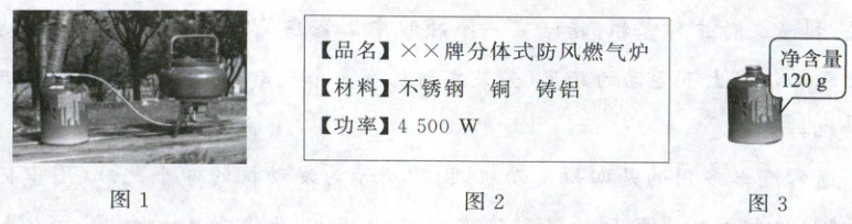 25. 临近夏天,很多人会约着亲朋好友在郊区、公园指定区域进行户外聚餐活动。小刚同学家购买了一款如图1所示户外分体式燃气炉,准备去户外野炊。该燃气炉的铭牌如图2所示,其中功率4500W是指气体燃料完全燃烧时燃气炉每秒放出4500J的热量。