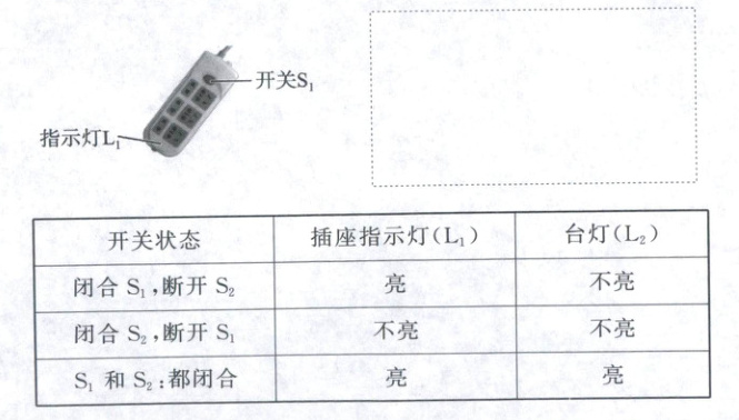 16. 小桐家台灯的插头插在如图所示的插座上,插座上有一个开关和一个指示灯(相当于灯泡).若插座开关和指示灯用$S_1、$$L_1$表示,台灯开关和灯泡用$S_2、$$L_2$表示.小桐断开或闭合$S_1、$$S_2$时,记录现象如下表,请你设计符合事实的电路图,并在虚线框内画出电路图.